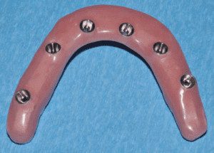 Remember, this type of prosthesis is screwed into the mouth, onto the implants. So, to allow for thorough cleaning, you need to be able to get the tools you use to clean it – to actually touch all the surfaces you want to clean. So, how do you make a screwed-in prosthesis that is cleansable?