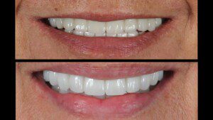 In cases such as these, there is a variation of the implant bridge which has some pink material built into it. This pink part is custom shaded to match the patient’s gum color, for a seamless, natural look. The bridge fits snugly up against the gums, and like other implant bridges, is done so in a convex manner so it is easy to keep clean. One thing patients love about them is that they are not bulky, like implant dentures. This makes them easier to speak and chew without retraining their tongues and cheeks to adapt and accommodate the bulkier Implant Denture/All-On-4 prostheses.
