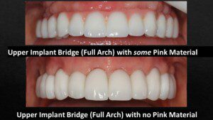 - There is (usually) no “pink” porcelain or zirconia on the implant bridge prosthesis. The gums are the patient’s own healthy, pink gums. In some cases, there must be some pink, if there was a significant amount of bone loss prior to treatment.