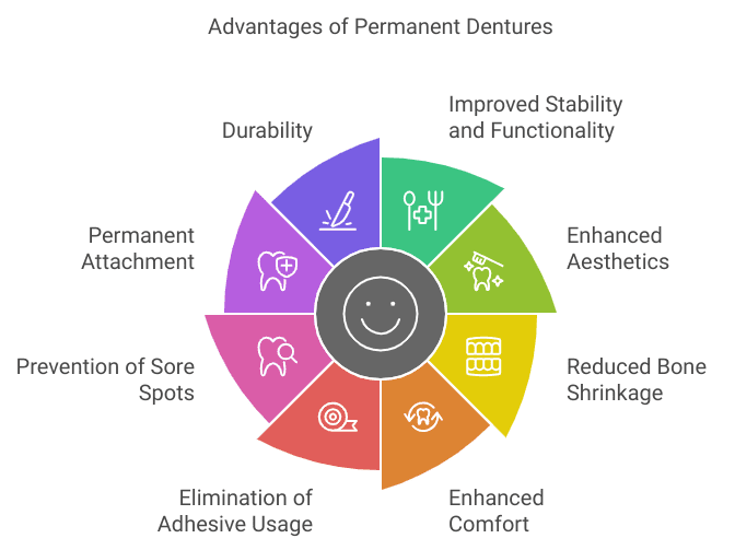 Permanent dentures offer significantly greater stability (they won’t slip or shift), improved chewing efficiency, and a more natural look and feel compared to removable dentures.