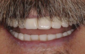 Smile GalleryTeeth Restorations without ImplantsDentures A happy patient. 1 of 13 This 63 year old man actually looked very youthful, with an attractive face and beautiful blue eyes. Obviously his teeth were of no more use to him. He could no longer use them for eating. No chewing teeth remain on the upper. The front teeth are badly crowded. Teeth do not drift backward in the mouth to fill gaps. Look at how much space is between the upper and lower jaws when the teeth and supporting bone is lost. The left side. The patient had a crown made on his front tooth many years ago. The panoramic radiograph reveals the massive loss of teeth and supporting bone. The upper denture covers the palate for stability and suction. This is the inside of the upper denture. The lower denture has to fit around the tongue. The upper and lower denture in the mouth. A happy patient.