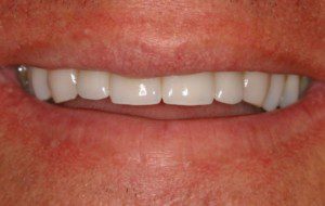 Close up view of four new front crowns. If you didn't see the before pictures could you tell which ones are the crowns? Our goal at the Dental Implant Center is to create beautiful smiles where no one would know these restorations are anything other than perfect, beautiful teeth.