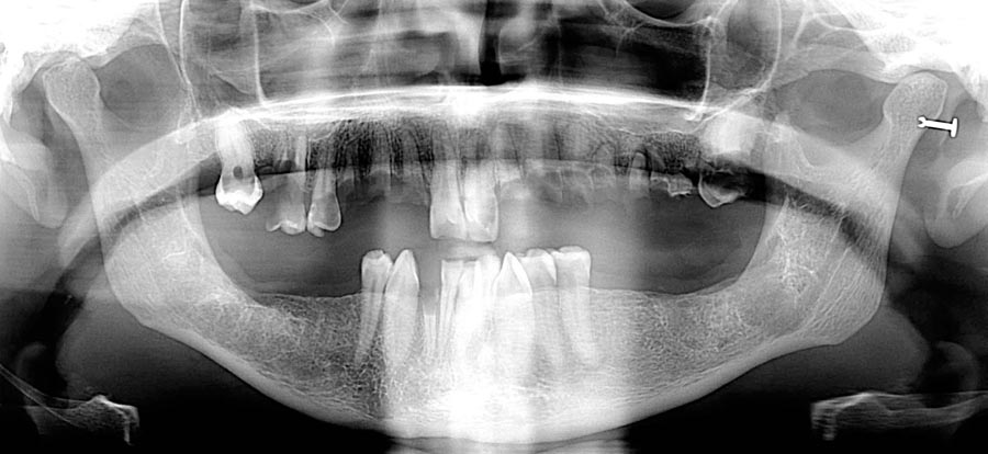 Her panoramic radiograph shows multiple missing and broken teeth along with tooth decay and areas of infection spreading into the bone.