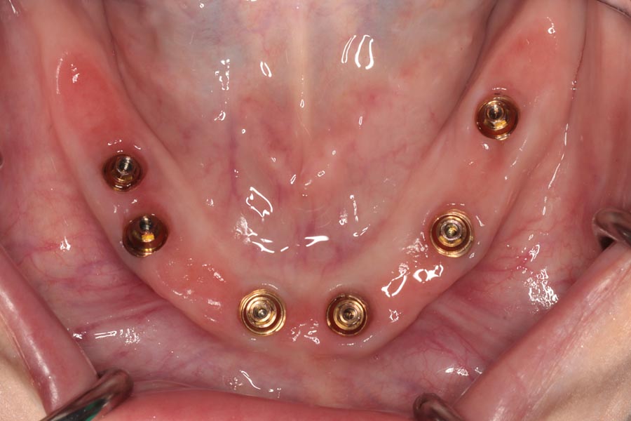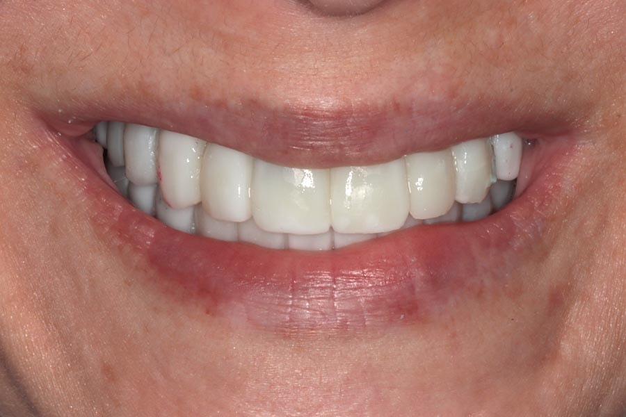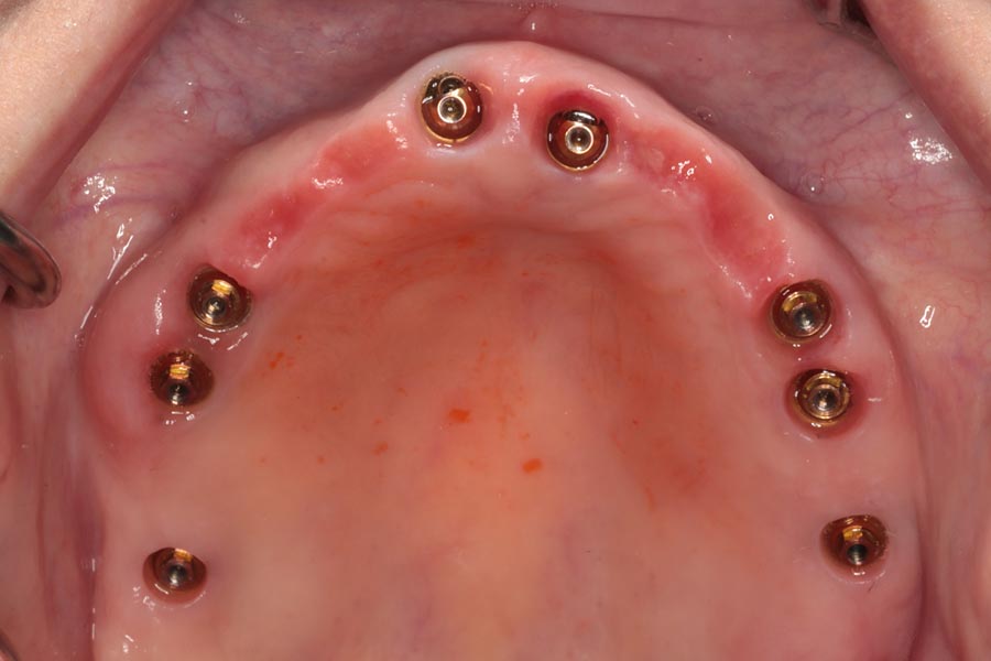 On the day of delivery, tissues are pink and healthy. The provisionals have helped to shape them perfectly to prepare them for the definitive restorations.