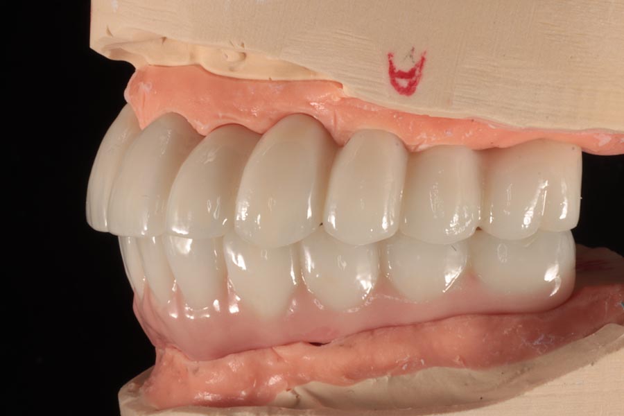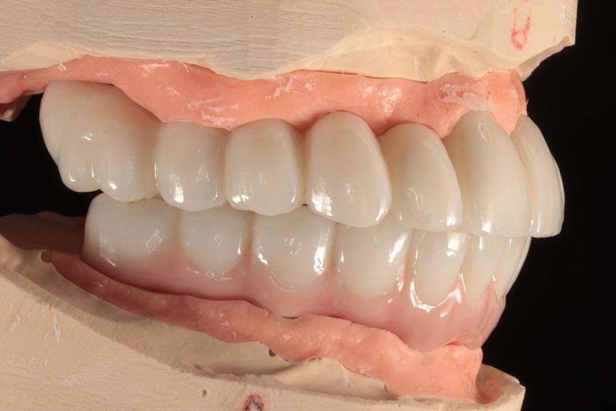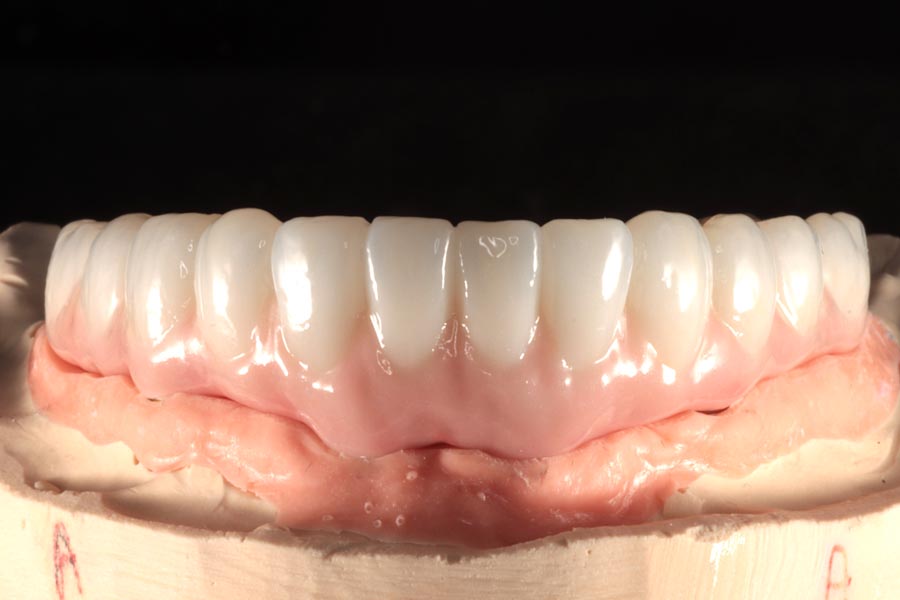 Prototypes are design and fabricated in wax so we can dial in the esthetics that we are looking for. In this particular case, a little pink was designed on the lower to compensate for tissue resorption while keeping tooth length proportional and balanced.