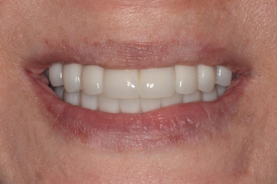 We use the provisionals at this stage as a starting point for designing definitive restorations. We assess them critically and discuss improvements that we would like to see. Tissues have also stabilized at this stage so the final restorations will be designed to compensate for any resorption that has taken place.