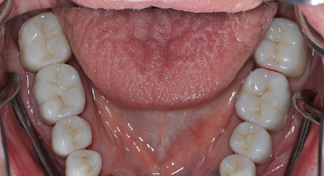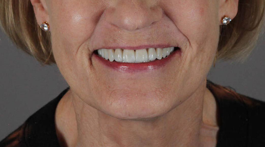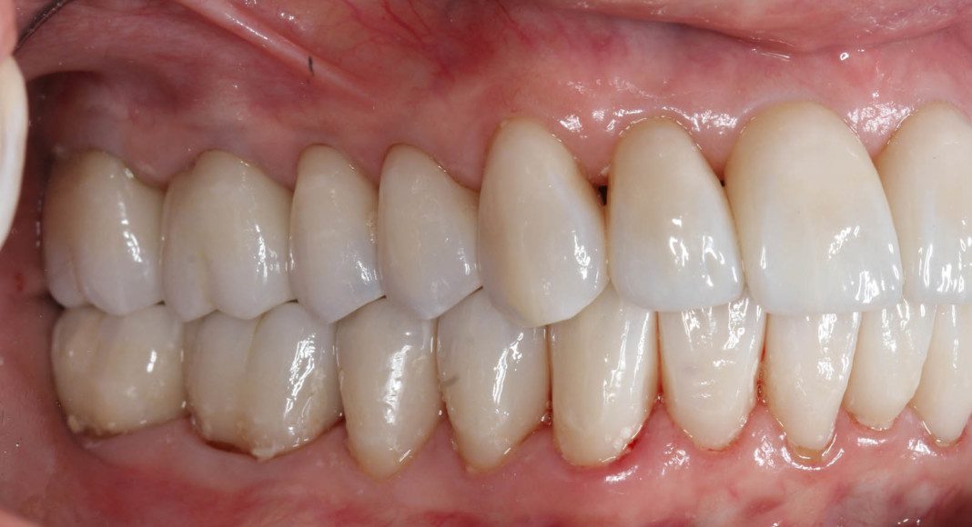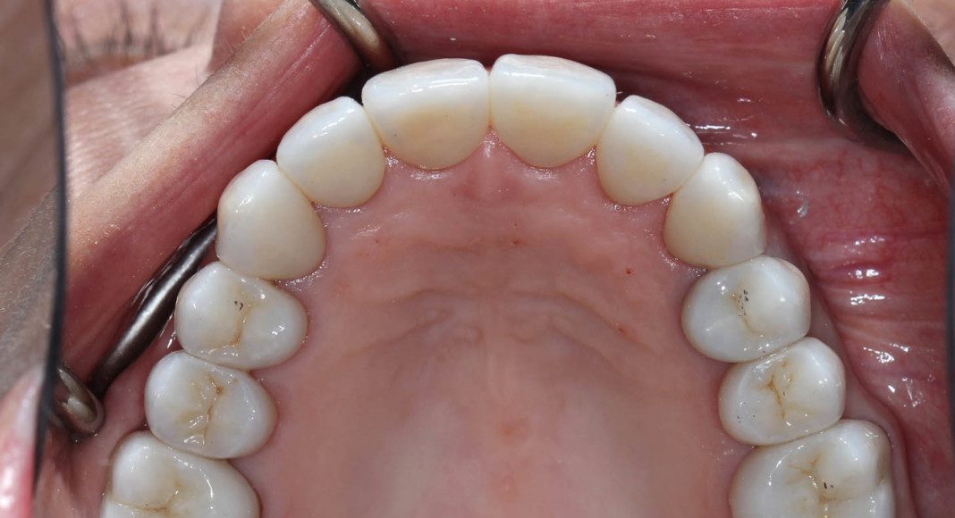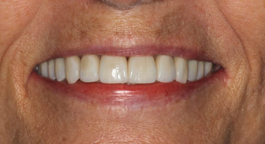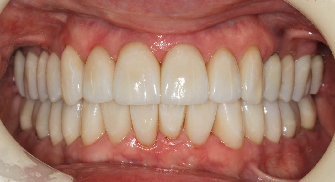 Upper final crowns, lower temporary crowns. I do not believe in attempting to deliver crowns in both jaws at the same time. Because the upper jaw is the most important in regard to aesthetics, I prefer to place them, first. When attempting to deliver both arches at the same time, there is usually a lot of bite adjustment. This scratches the crowns and makes them rough like sandpaper. This then wears the porcelain faster and it feels rough to the patient.
