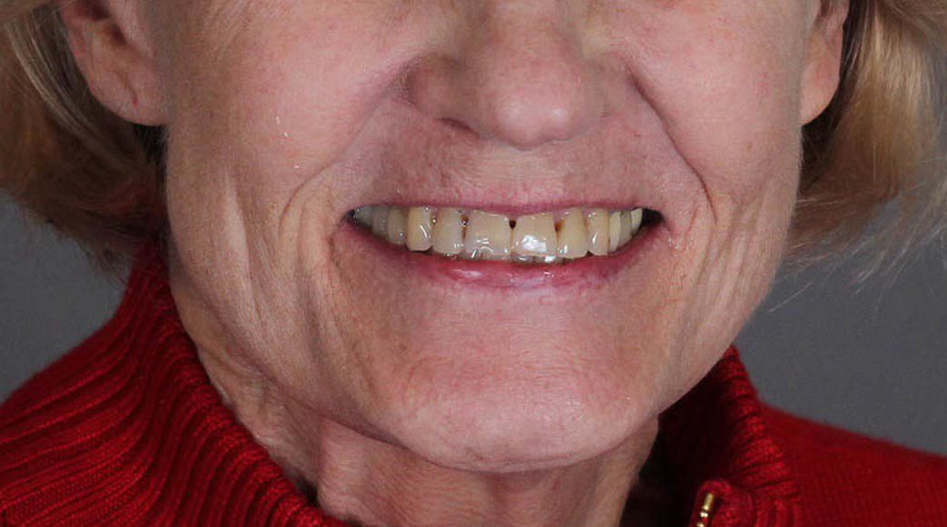 This is the before of a diagnostic wax-up. We take imperfect teeth and make them perfect with wax (next picture). Note: this is not the patient being shown in this case report.