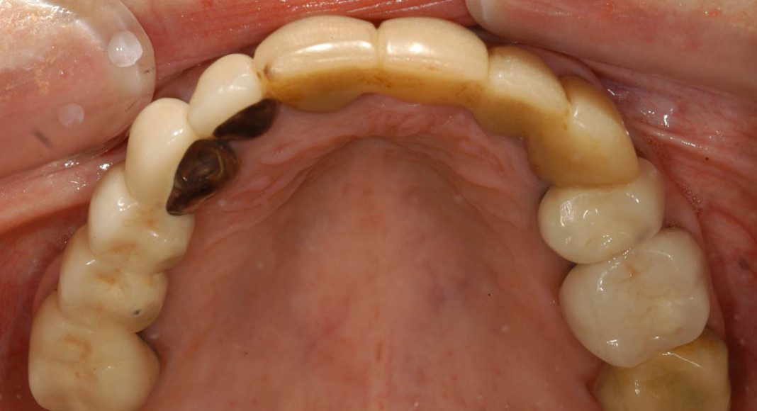 Case 2: This patient presented with one missing upper tooth and a mouth full of very old restorations of just about every kind. She was 88 when she came to us, and still had almost all of her natural teeth!