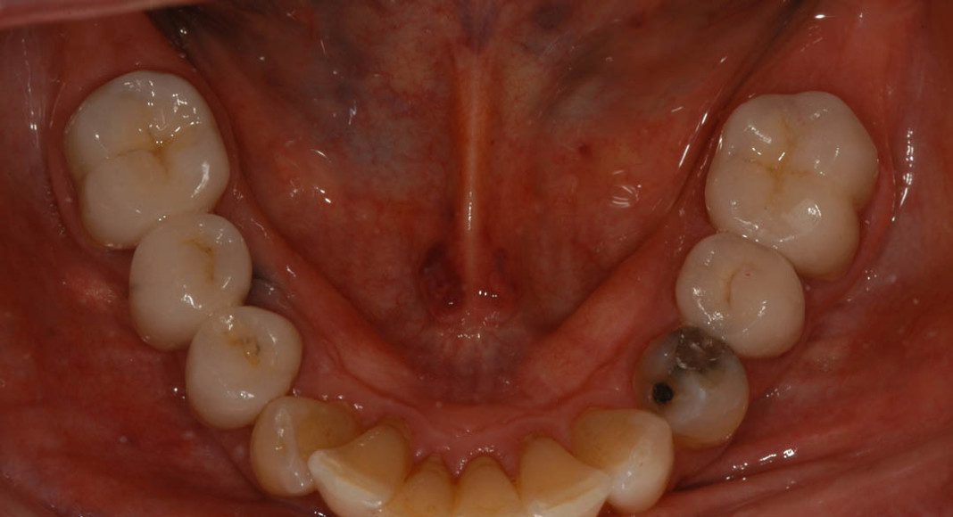 Pre-treatment, lower arch view. We removed the broken lower right molar and replaced it with an implant and crown, placed two more implants on the other side with a three tooth fixed implant bridge, and made crowns for two other teeth.