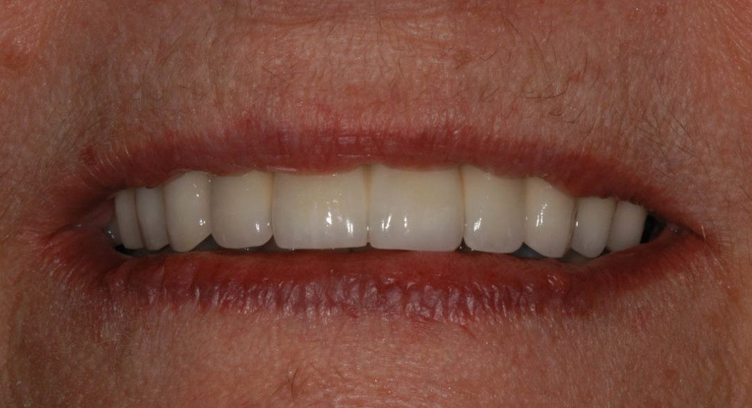 Final crowns and a bridge, lower arch. Her lower 8 front teeth were still in good shape, so we bleached them so she could choose a lighter shade with her final crowns and have a beautiful smile.
