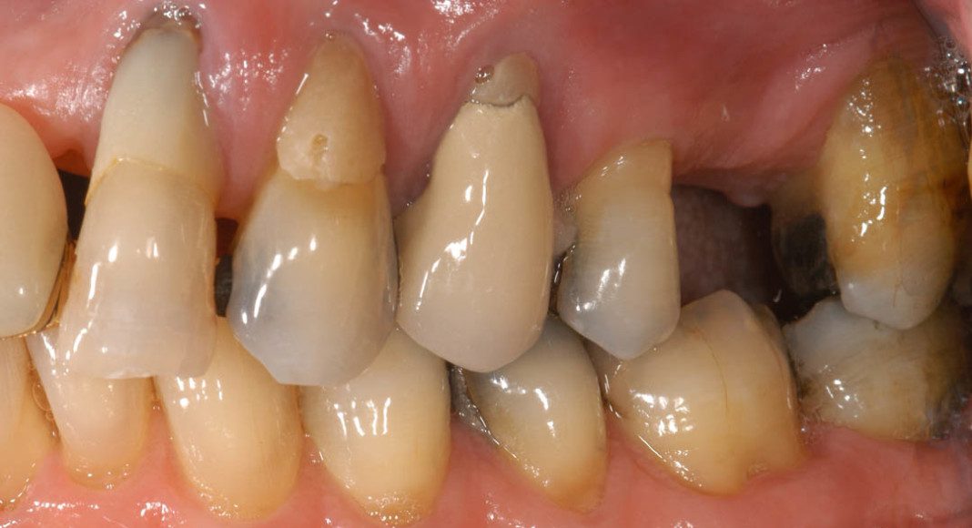Pre-treatment, left lateral view. Notice the exposed margins of the old crowns from all the gum recession? These areas were very sensitive when she ate cold or sweet things. (We were able to correct that with the new crowns).