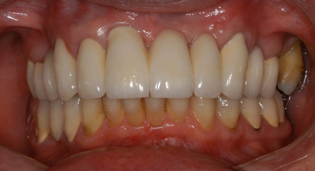Pre-treatment, lips retracted. Notice the exposed roots on several of the back teeth, and the metal margins around some of the crowns? Also, she did not like the gum line above her two front teeth being uneven.